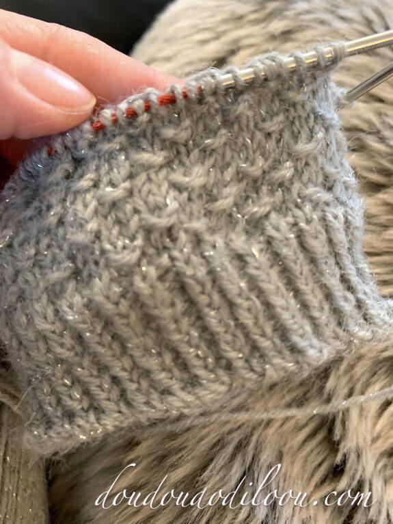 Celles ci sont en fil gris avec un fin fil métallisé argenté Schachenmayr Regia Soft Glitter. Le fil reste très confortable et ne gratte pas du tout. en plus, il a l’air résistant.