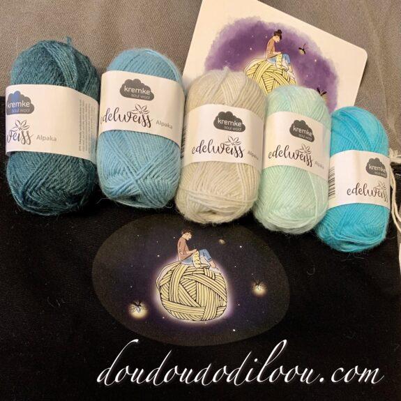 Le fil est Kremke Soul Wool Edelweiss Alpaka et j’ai pris les mini pelotes dans un kit du site Lili Comme Tout. Cette laine est hyper douce.